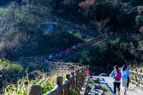 “这是一场奔跑在画里的比赛。”来自杭州的越野爱好者陈先生刚冲过20KM组终点线,汗水浸湿了衣衫却难掩兴奋,“每一步都是与自然和历史的对话,这种体验太独特了。”本次比赛以“山野为赛道,古道为纽带”,将建德乾潭镇梓洲村的田园静谧与浦江虞宅乡新光村的文创活力完美串联。作为浙江唯一入选长三角十大经典徒步线路,马岭古道不仅是《富春山居图》的实景延伸,更是藏着丹霞奇峰、竹海云梯、溪涧飞瀑的自然秘境。起点马岭天观坐拥中国第一大佛手桥;途中美女峰亭亭玉立,雪雾缭绕时更添神秘韵味;终点新光村粉墙黛瓦,古建筑与文创小店相映成趣,让参赛者在奔跑中沉浸式感受浙西之美,也见证了两地通过"党建联建"促进文旅资源共享的显著成效。